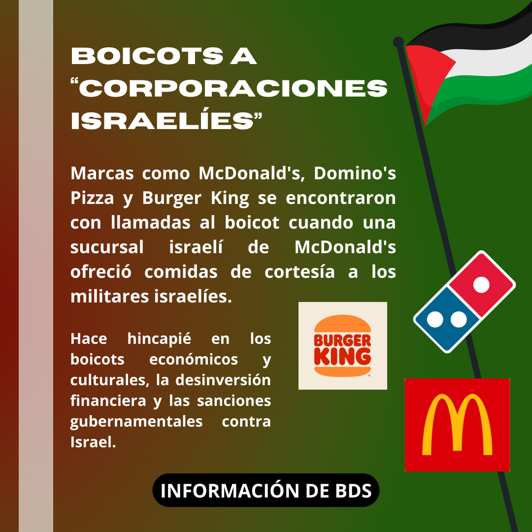 Algunas de las "corporaciones israelíes" que se encuentran en la lista de BDS para los boicots son: Ahava, HP, Siemens, Carrefour, AXA, Puma, además de McDonald´s, Starburcks y Burger King.