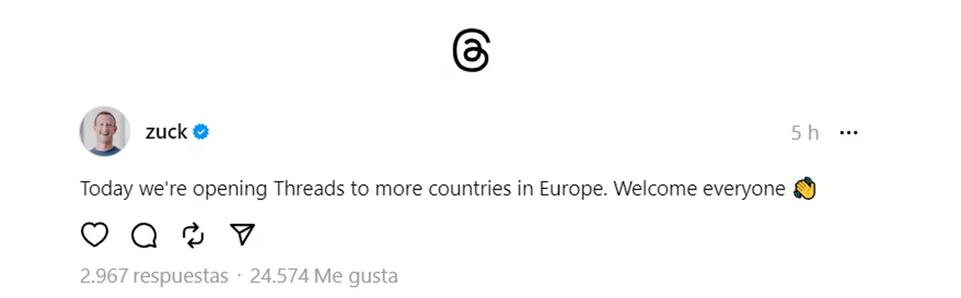 Anteriormente había expresado su aspiración de impulsar Threads hasta superar los 1.000 millones de usuarios globales en los próximos años. Aunque todavía está lejos de este objetivo, el lanzamiento europeo le acerca un paso más.