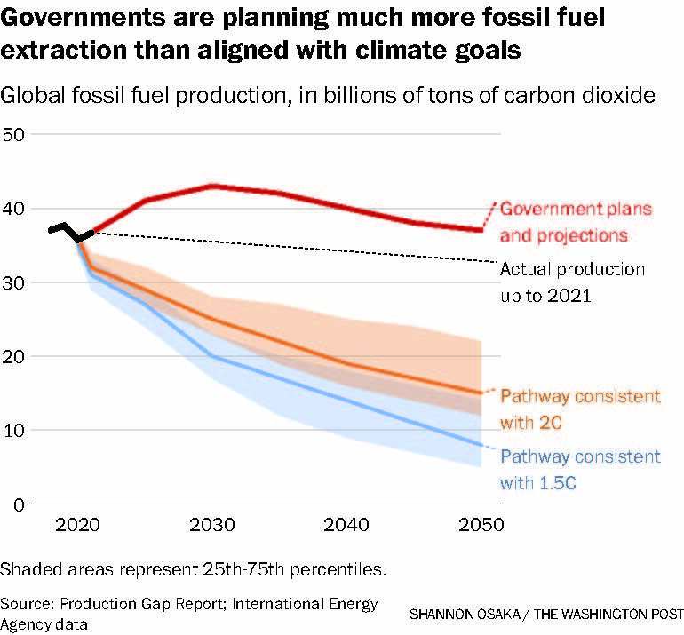 Según el Informe sobre la Brecha de Producción, un proyecto del Programa de las Naciones Unidas para el Medio Ambiente y grupos de investigación, las proyecciones y planes de los países para la producción de combustibles fósiles en 2030 son más del doble de la cantidad necesaria para un límite de calentamiento de 1,5 grados Celsius.