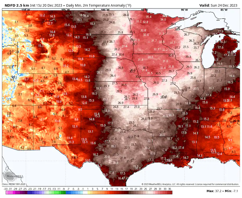 Para el fin de semana festivo, las mínimas matinales en el Alto Medio Oeste podrían dispararse hasta 40 grados por encima de lo normal, estableciendo nuevos récords y transformando los paisajes nevados en panoramas cálidos y verdes.