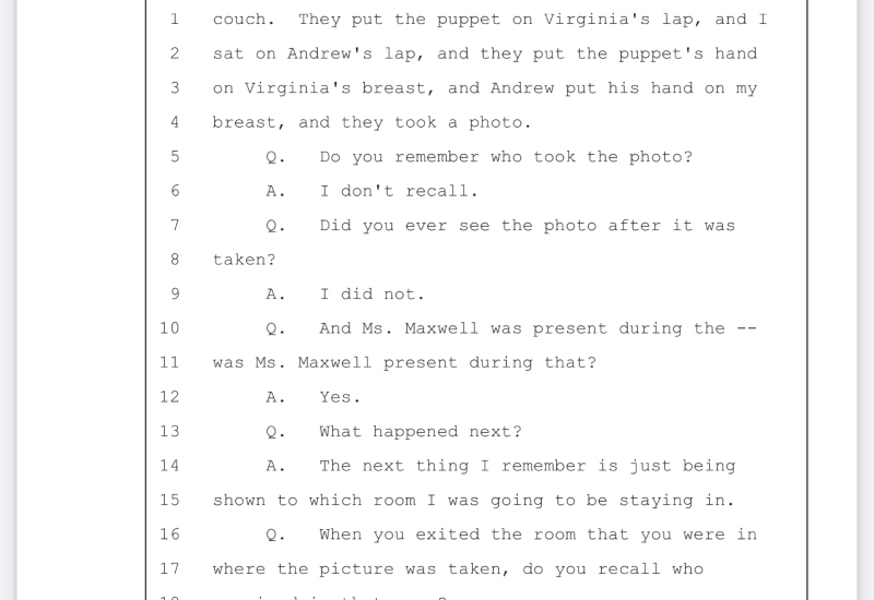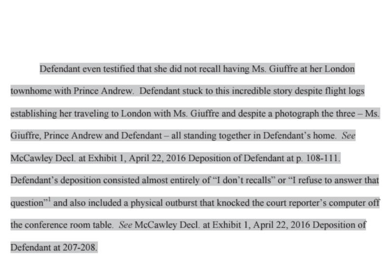 “La acusada (Ghislaine Maxwell) incluso testificó que no recordaba haber tenido a Giuffre en su casa de Londres con el Príncipe Andrew. La demandada se apegó a esta increíble historia a pesar de que los registros de vuelo que establecían que viajó a Londres con Giuffre y a pesar de una fotografía de los tres: la Sra. Giuffre, el príncipe Andrés y Maxwell”.