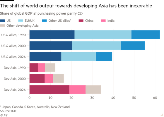 Asia en desarrollo también sigue siendo la región de más rápido crecimiento en el mundo. Dada la habilidad, y la oportunidad, de ponerse al día, es una apuesta segura que esto continuará. El centro de gravedad de la economía mundial seguirá desplazándose hacia estas regiones. Eso inevitablemente creará cambios políticos. De hecho, ya lo ha hecho. El rápido ascenso económico de China es el gran hecho geopolítico de nuestra era. A largo plazo, el ascenso de la India también es probable que tenga grandes consecuencias globales.