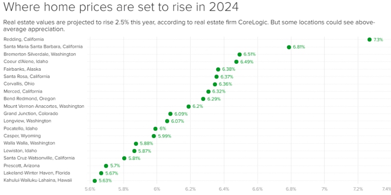 De acuerdo a la proyección de CoreLogic, los subidas de los precios inmobiliarios más significativas en 2024 van desde Alaska hasta Arizona, incluyendo cinco ciudades de California y cuatro de Washington.