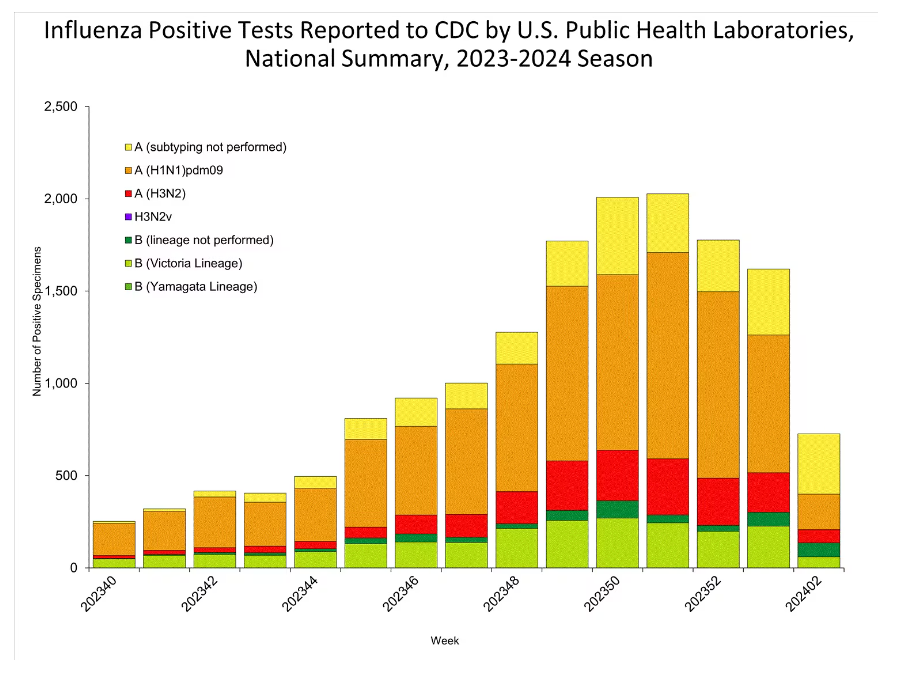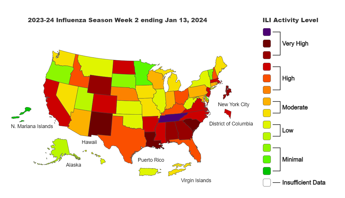 Las infecciones por influenza igual mantienen al país en alerta. 25 estados informan ahora de niveles altos o muy altos de casos de síntomas de influenza.