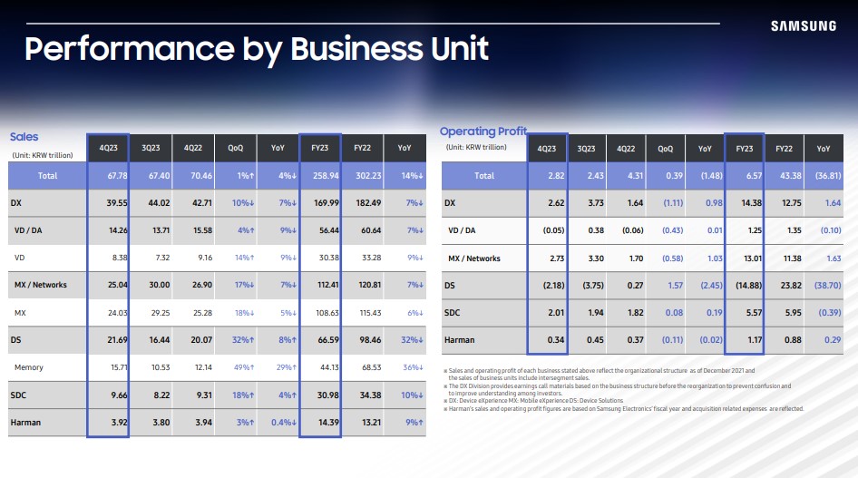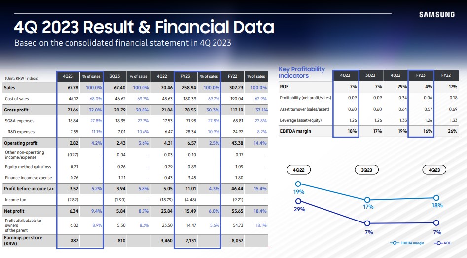 Los ingresos en el cuarto trimestre de 2023 de Samsung Semiconductor descendieron un 3,8% en comparación con el año anterior. Además, el beneficio operativo experimentó un descenso significativo, desplomándose un 34,57%.