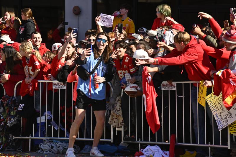 Los ganadores del Super Bowl interactuando con los fanáticos que se alineaban a lo largo del famoso Grand Boulevard de Kansas City.