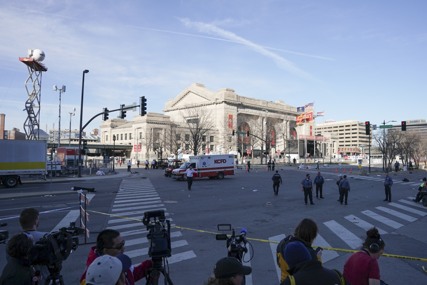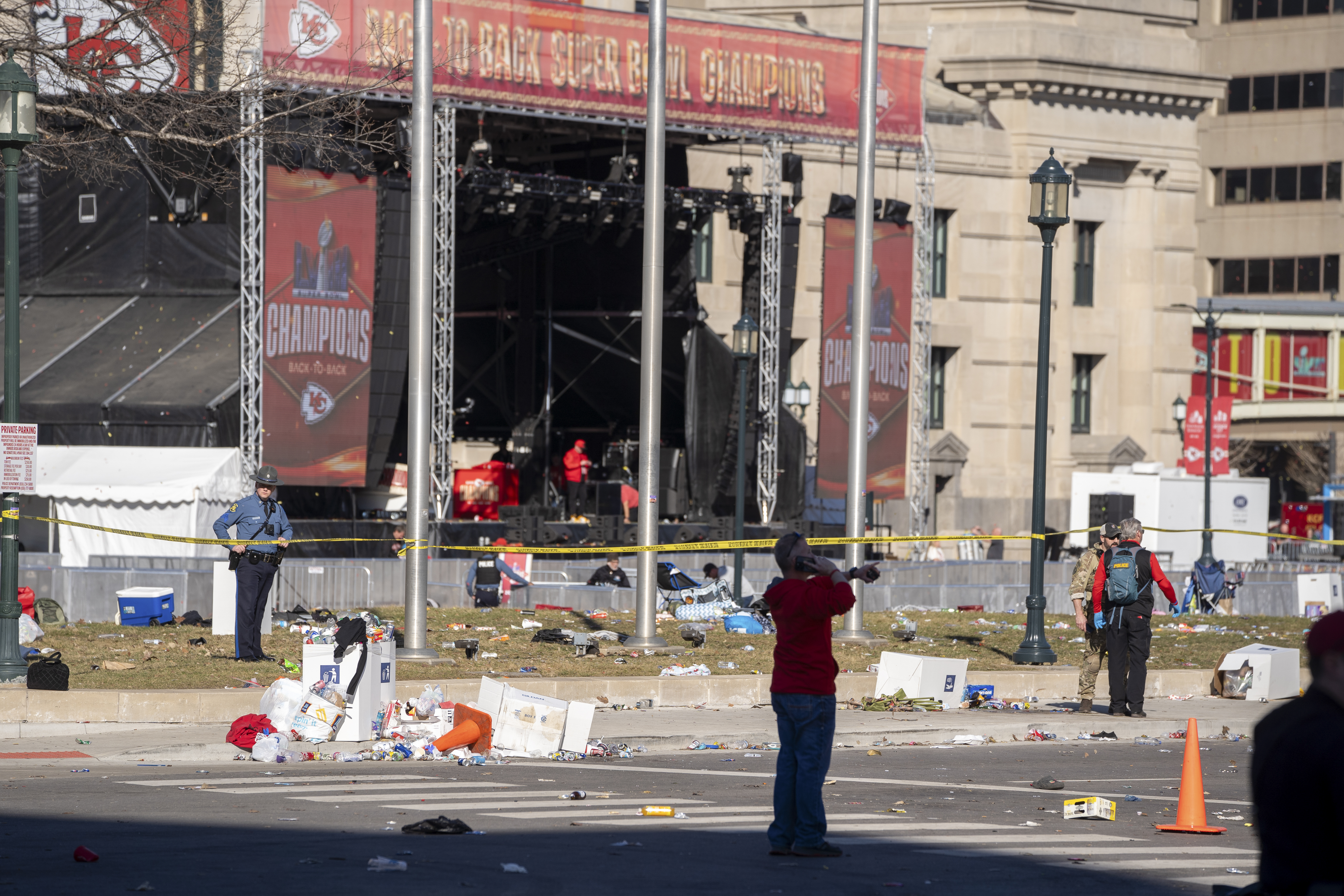 Reporteros trabajan en la línea de policía después de que se produjeron disparos cerca del desfile de la victoria del Super Bowl de Kansas City en Kansas City. Foto: (Christopher Smith/The New York Times).Credit: NYTThe scene at the event stage after shots were fired near the Kansas City Super Bowl victory parade in Kansas City, Mo., Feb. 14, 2024. A rally to celebrate the Kansas City football team’s Super Bowl victory was marred when several people were shot near the city’s Union Station on Wednesday afternoon, the police said. (Christopher Smith/The New York Times) Credit: NYT
