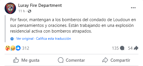Expresando su solidaridad, el Departamento de Bomberos de Luray envió un mensaje en Facebook, instando: "Por favor, mantengan a los bomberos del condado de Loudoun en sus pensamientos y oraciones".