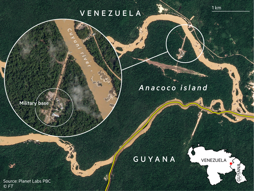 Pero imágenes satelitales publicadas la semana pasada por el Centro de Estudios Estratégicos e Internacionales, un centro de investigación en Washington, parecían mostrar un despliegue de tanques ligeros y lanchas patrulleras armadas en la Isla de Anacoco en la frontera de la región de Essequibo, donde Venezuela está expandiendo una base militar para albergar hasta 300 tropas.