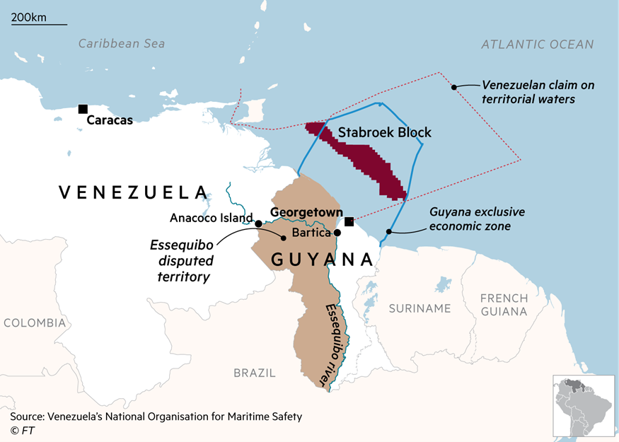 Caracas ha disputado durante mucho tiempo una decisión de un tribunal de arbitraje internacional en 1899 de otorgar el Esequibo, un área aproximadamente del tamaño de Inglaterra y hogar de unas 125,000 personas, a la entonces Guayana Británica. Ha escalado sus reclamos desde que el grupo energético estadounidense ExxonMobil hizo grandes descubrimientos de petróleo frente a la costa de la región en 2015.
