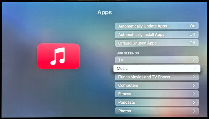 3. Continúe desplazándose hasta encontrar y seleccionar Música bajo el epígrafe Ajustes de Apps.