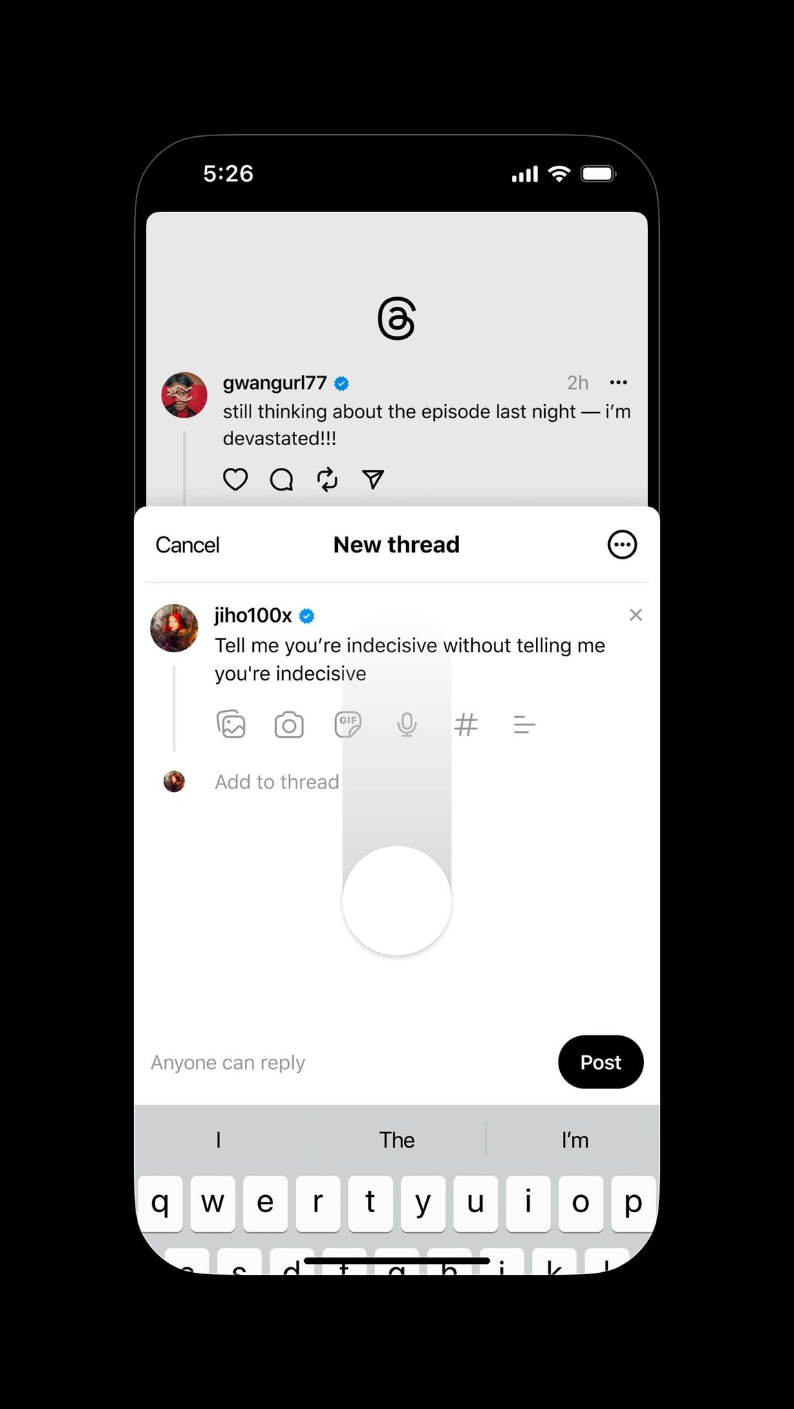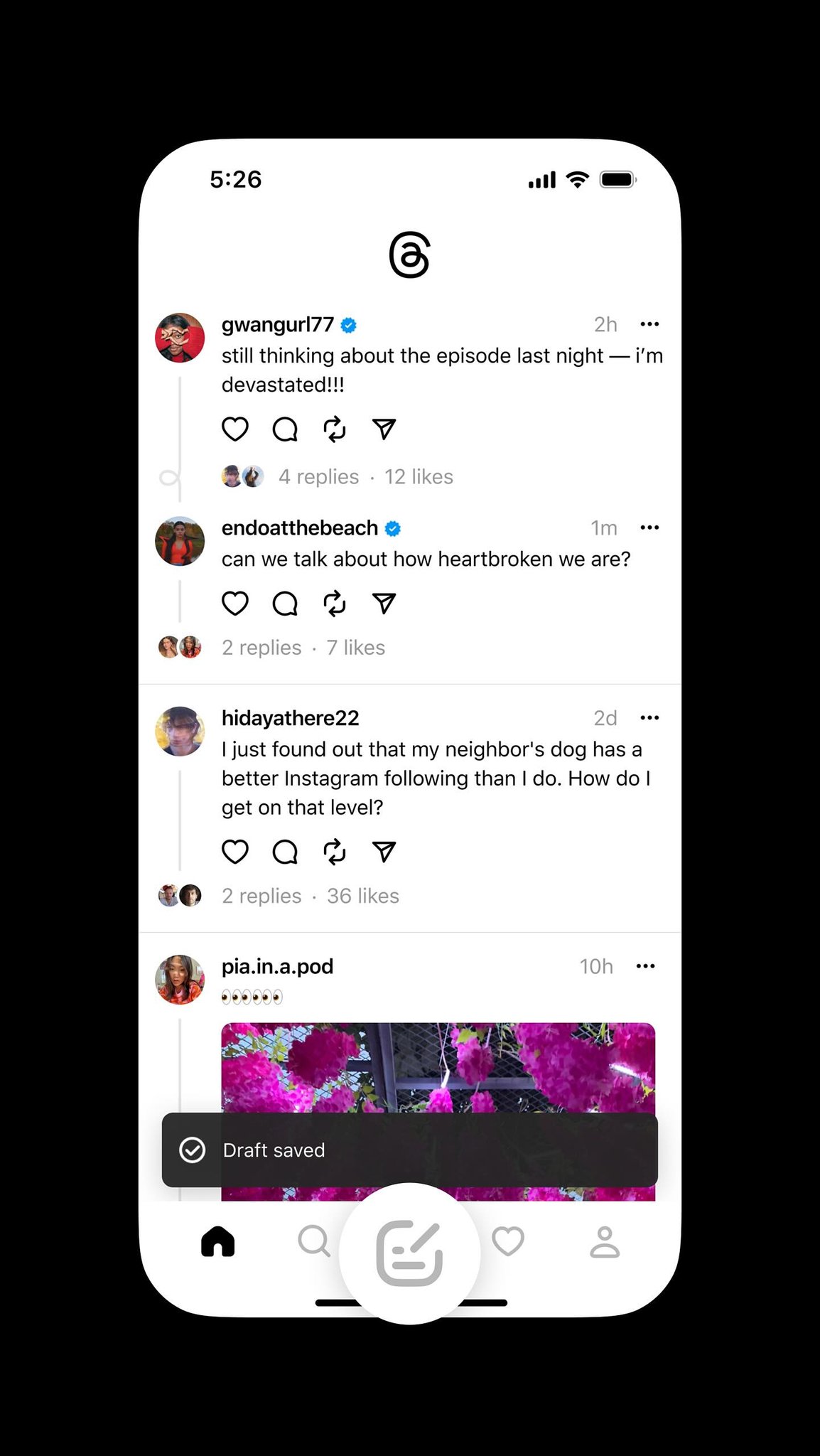 Un simple deslizamiento hacia abajo bastará para asegurar el borrador. Además, Threads muestra ahora un icono de compositor alterado en la barra de navegación, que indica que hay un borrador sin publicar a la espera de su compromiso.