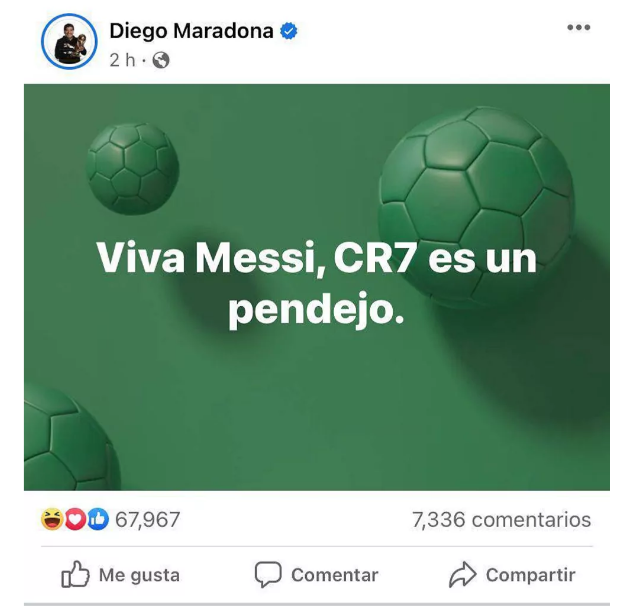 Poco a poco las publicaciones de "Maradona" fueron subiendo de tono al grado de insultar al portugués Cristiano Ronaldo, quien tuvo una importante rivalidad deportiva con el argentino Lionel Messi cuando defendía la camiseta del Real Madrid y Barcelona, respectivamente.