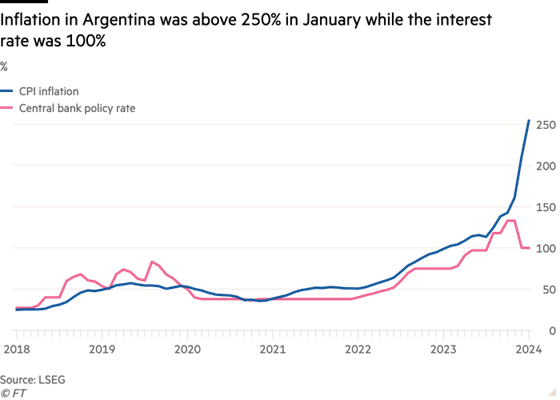"Hemos evitado la hiperinflación", dijo el líder autodenominado anarcocapitalista al Financial Times. "Nuestro objetivo es seguir bajando la inflación... [y] terminar de limpiar el [balance del banco central]. Una vez que el banco central esté limpio, planeamos levantar los controles cambiarios... el FMI estima que podríamos hacerlo a mediados de año".