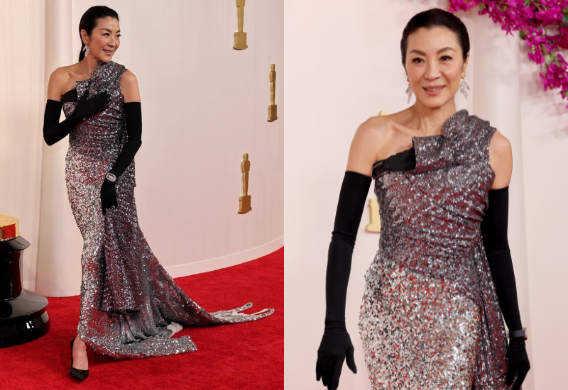 La actriz, presentadora del evento este año, llegó a la alfombra roja con un vestido de lentejuelas y un solo hombro, una creación personalizada de Balenciaga.