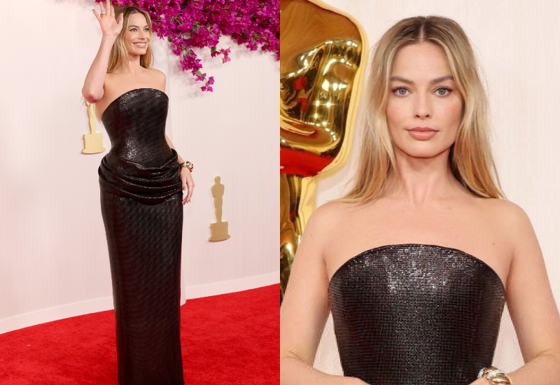 Robbie llevaba un vestido sin tirantes con fruncido en la cadera hecho de una cota de malla negra brillante, recién salido de la pasarela de Versace.