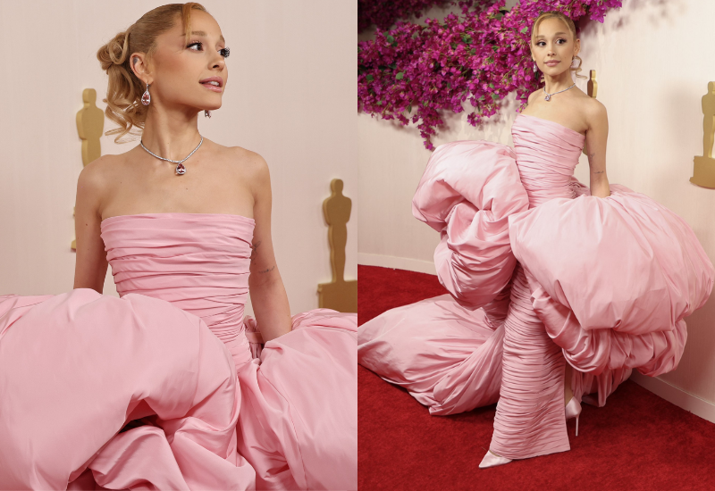La actriz y cantante lució un vestido rosa bebé sin tirantes de Giambattista Valli Haute Couture, con una capa a juego con proporciones extendidas que incluían una cola larga y voluminosas mangas.