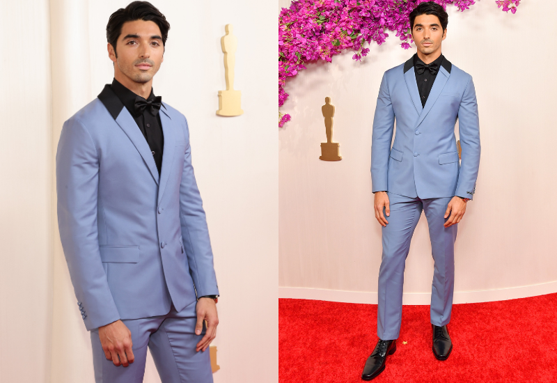 El actor destacó entre la gran cantidad de hombres vestidos de negro, luciendo un traje Prada azul claro con detalles y calzado en negro intenso, diseñado por Jason Bolden.