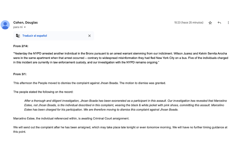 - En un comunicado del 1 de marzo de 2024, la oficina del Fiscal de Distrito en Manhattan dice que Boada fue exonerado como participante del ataque hacia los policías y que, en realidad, quién les atacó fue otra persona.