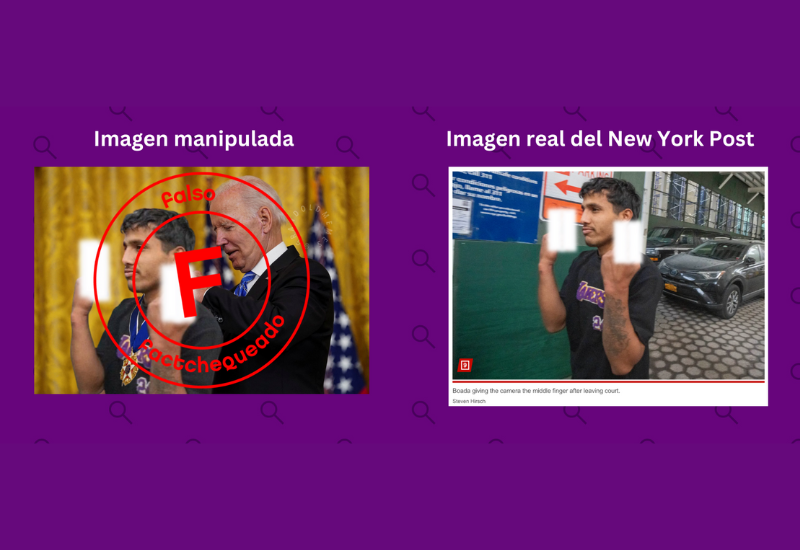 - Circula una imagen con más de 43.3 millones de vistas en X (antes Twitter), donde se ve al presidente de los Estados Unidos, Joe Biden, poniendo una medalla a Jhoan Boada, una persona que fue acusada erróneamente de golpear a 2 oficiales del Departamento de policía de Nueva York. Pero la imagen es falsa.