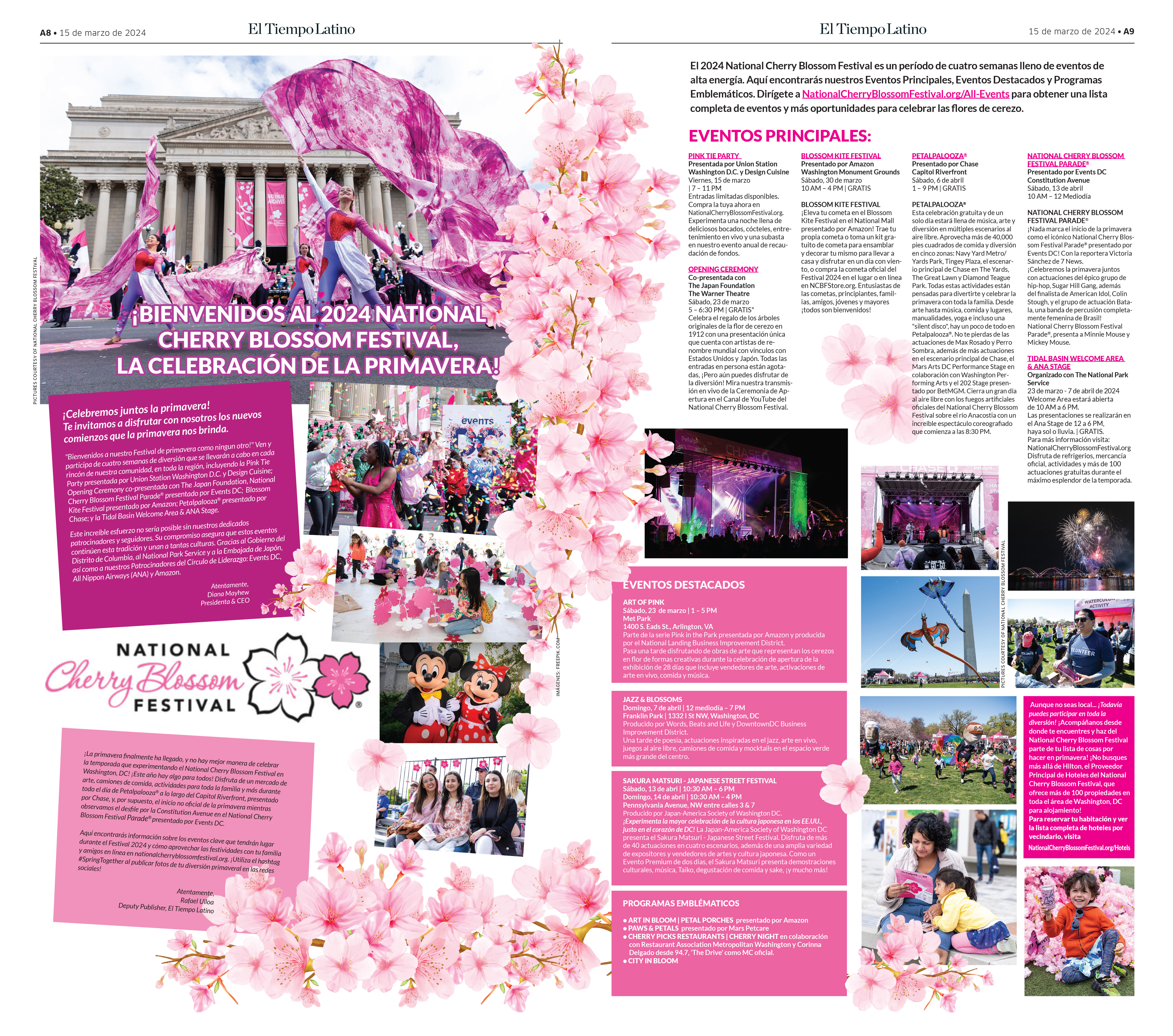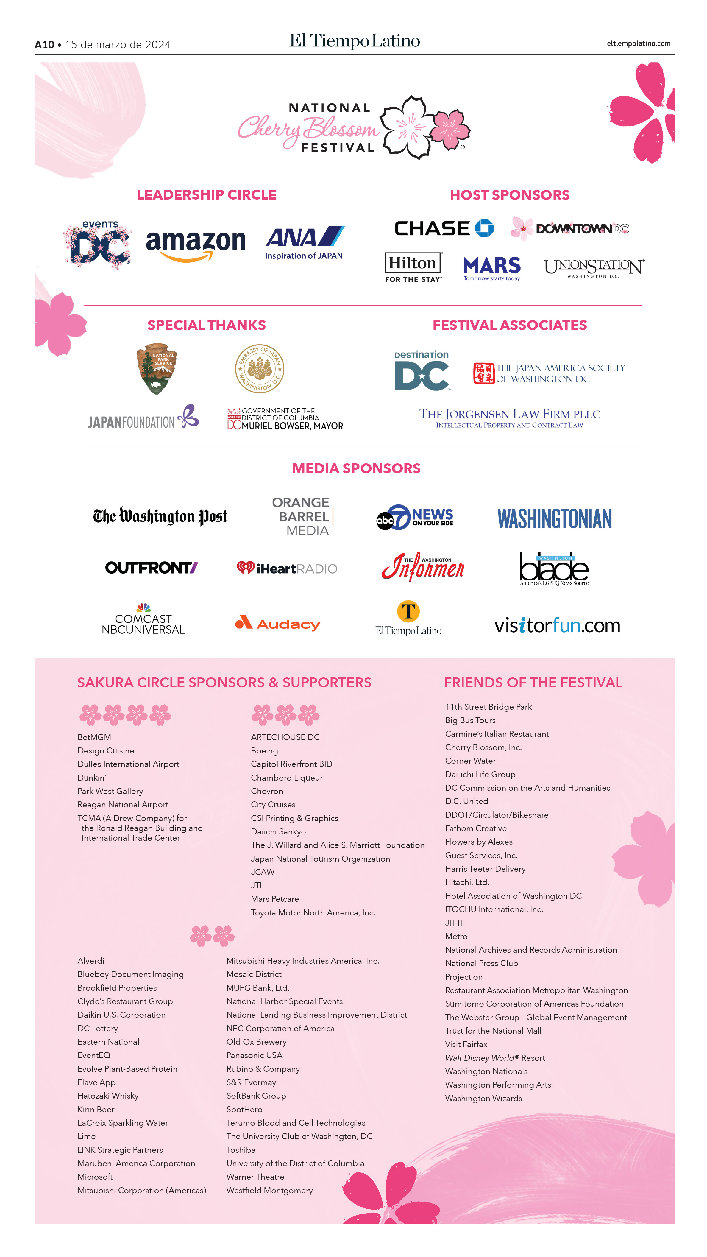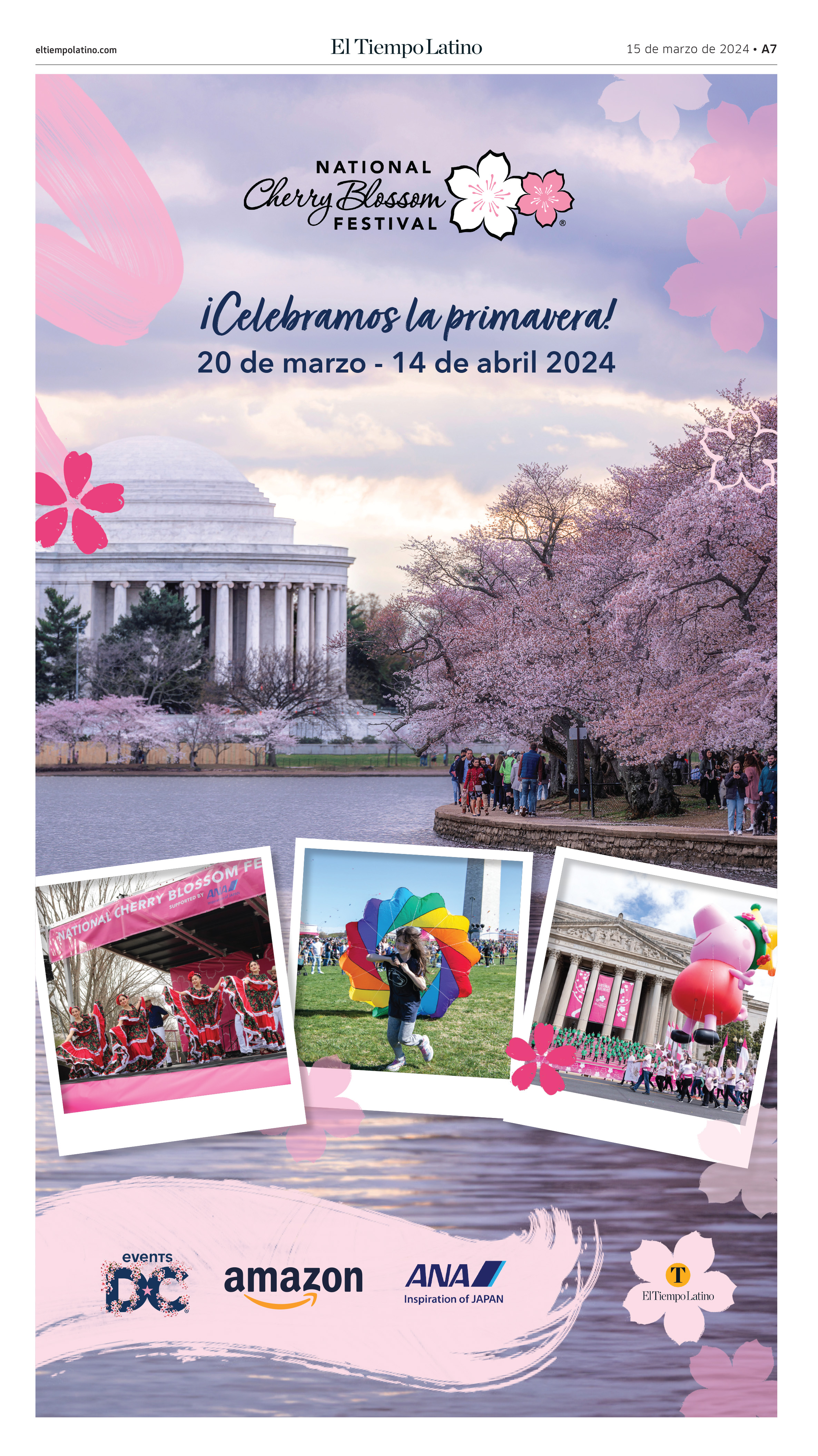 Para más información visita: NationalCherryBlossomFestival.org Disfruta de refrigerios, mercancía oficial, actividades y más de 100 actuaciones gratuitas durante el máximo esplendor de la temporada.