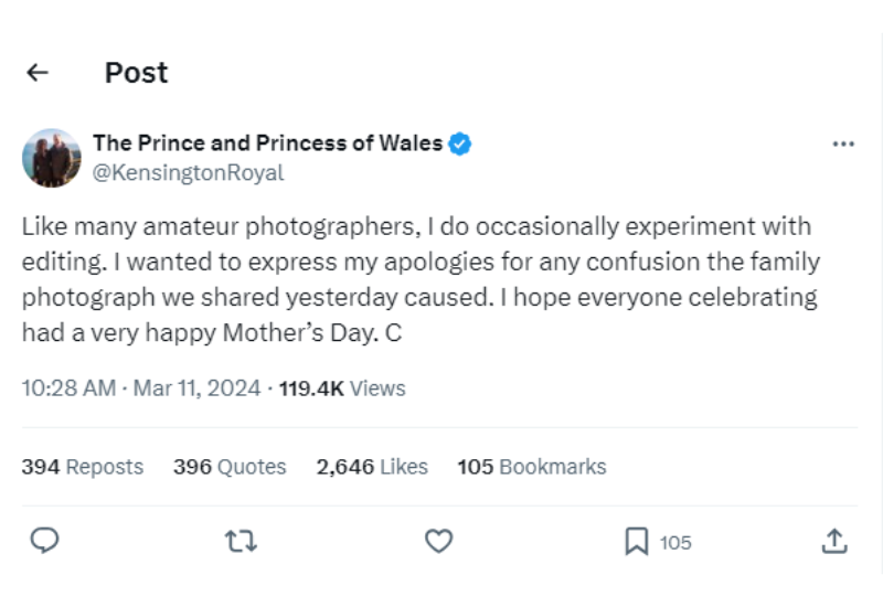A través de un tuit publicado el 11 de marzo de 2024 desde la cuenta oficial de los príncipes de Gales, un mensaje supuestamente firmado por la propia Kate Middleton con una “C” (de Catherine) afirma que “como muchos fotógrafos aficionados, de vez en cuando experimento con la edición”. Quería expresar mis disculpas por cualquier confusión que haya causado la fotografía familiar que compartimos ayer…”.