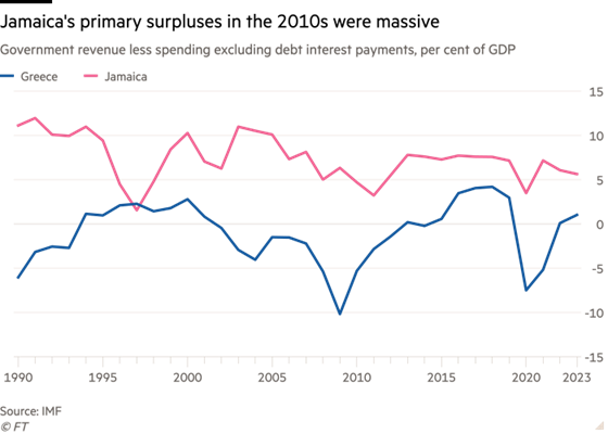 Es crucial destacar lo extremo de esta medida. Durante la década de 2010, los griegos protestaron por las duras condiciones impuestas por la Troika —el FMI, el Banco Central Europeo y la Comisión Europea— y eventualmente lograron un superávit primario de aproximadamente el 4 % del PIB. Tras un programa con el FMI acordado en 2013, Jamaica superó el 7 % del PIB durante siete años consecutivos.