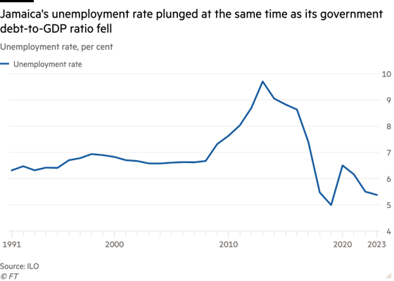 En la década de 2010, el desempleo cayó. Pero, aunque el crecimiento de Jamaica se volvió menos volátil, también fue lento. Los límites fiscales estrictos han suprimido el gasto en infraestructura. "No tenemos una idea clara de si un poco menos de consolidación fiscal —con fondos adicionales que se hubieran destinado a cosas como el gasto en educación o en salud— podría haber sido igualmente bueno o mejor", dice Eichengreen. Por tanto, hay margen para mayores estudios.