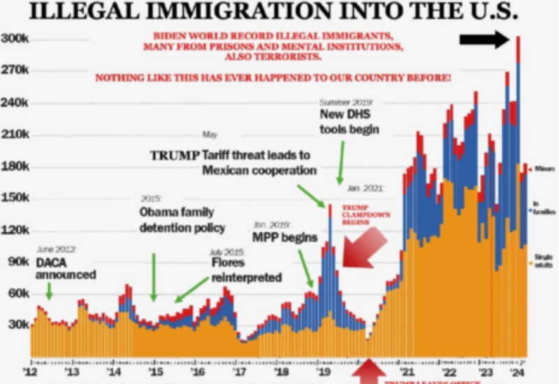 Sin duda, la inmigración ilegal se disparó después de que Biden asumiera el cargo, como muestra el gráfico, incluso sin tener en cuenta la baja pandémica.