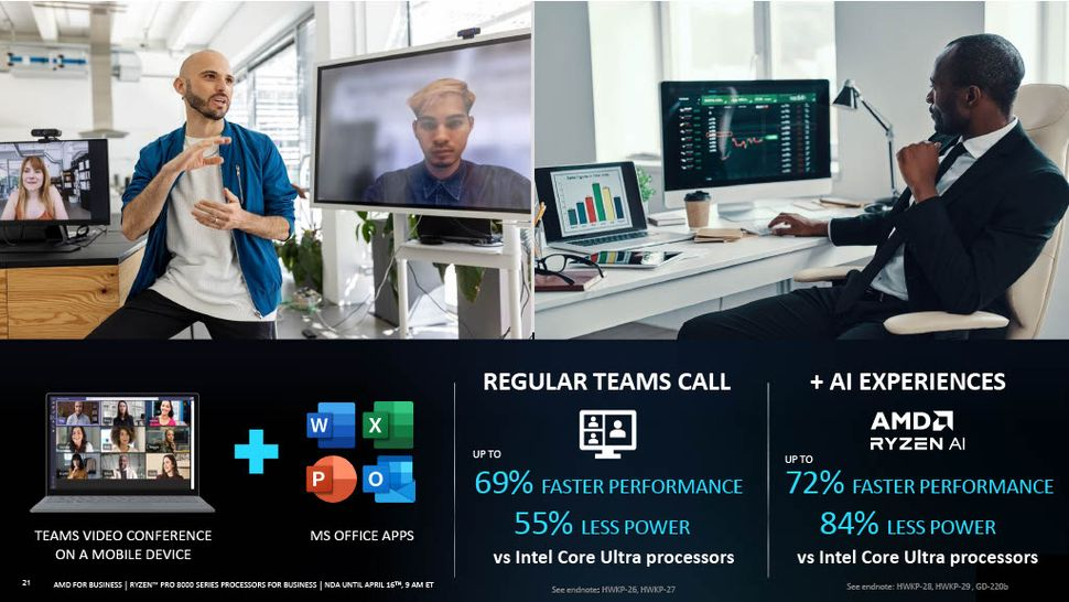 AMD afirma que su Ryzen 9 Pro 8945HS de 45W para estaciones de trabajo supera con creces a la competencia en tareas de IA.