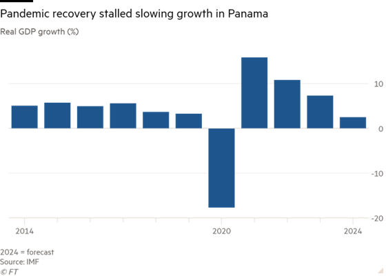 Un auge posterior a la dictadura en el país centroamericano, famoso por su canal, una importante arteria del comercio global, se está desvaneciendo, con el FMI pronosticando una desaceleración drástica en el crecimiento del producto interno bruto al 2,5% este año, desde un 7,5% en 2023.