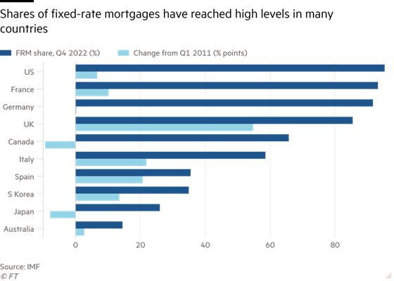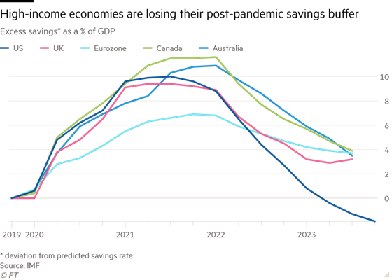 Una pregunta interesante es por qué el endurecimiento monetario ha tenido tan poco efecto en la producción. Una explicación es que la política fiscal fue de apoyo, notablemente en EEUU. Otra explicación es que las tasas de interés reales cayeron, en lugar de aumentar, porque la inflación fue muy alta. Eso está cambiando ahora. Otra es que una alta proporción de hipotecas están a tasas fijas: ha habido un aumento particularmente grande de la proporción de éstas en el Reino Unido. Además, el aumento en el ahorro durante la pandemia ayudó a financiar el gasto. Sin embargo, esto está terminando. Las políticas monetarias ajustadas podrían todavía tener un impacto rezagado considerable.