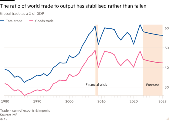 La desaceleración en el crecimiento de la PTF representó más de la mitad del declive general en el crecimiento. Según el WEO, la creciente mala asignación de capital y trabajo entre las empresas dentro de los sectores explicó gran parte de esta desaceleración. Se pueden cambiar tales cosas. Pero no será fácil hacerlo. Una de las razones de esta desaceleración probablemente sea la pérdida de dinamismo en el comercio mundial, que siempre es una fuente potente de competencia.