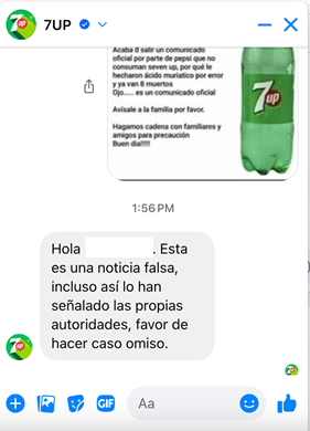 - 7Up explicó a Factchequeado a través de su cuenta oficial de Facebook que “esta es una noticia falsa, incluso así lo han señalado las propias autoridades, favor de hacer caso omiso”.