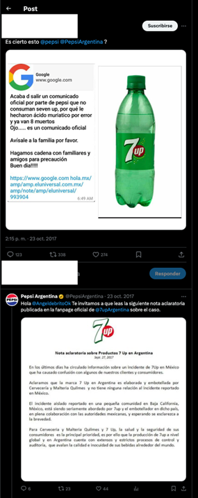 Pepsi respondió con un comunicado de la cuenta en X de 7Up en Argentina, con fecha de 27 de septiembre de 2017, en el que mencionó un incidente de 7Up en una comunidad del estado de Baja California, México, y que dijo que estaban abordando el tema “seriamente” , pero que no tenía relación con la distribuidora en Argentina. El comunicado no mencionó detalles del incidente.