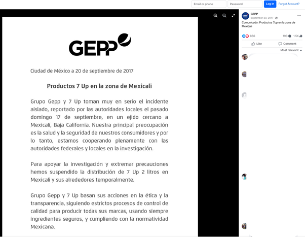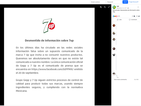 El 23 de septiembre de 2017, 7Up publicó en su cuenta de Facebook un mensaje desmintiendo un “supuesto comunicado de la marca 7Up que invita a no consumir” sus productos. En la misma publicación, 7Up menciona un comunicado, con fecha del 20 de septiembre de ese año, de la cuenta de Facebook del grupo embotellador de bebidas en México, GEPP, en el que hablan sobre “un incidente reportado por autoridades locales” el 17 de septiembre de 2017 en la ciudad de Mexicali, México, por lo cual suspendieron temporalmente la distribución de 7Up de 2 litros.