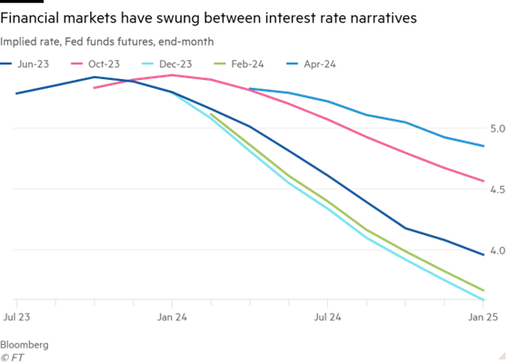 Fue todo un giro. Al final del año pasado, los mercados de futuros habían anticipado seis recortes en las tasas de interés para EEUU en 2024. A medida que continuaban llegando datos de una inflación persistente durante el primer trimestre, los operadores comenzaron a alinearse lentamente con el pronóstico de la Reserva Federal de EEUU de solo tres. Pero, durante las últimas dos semanas, aquellos que aún esperaban varios recortes este año han comenzado a parecer contrarios obstinados.