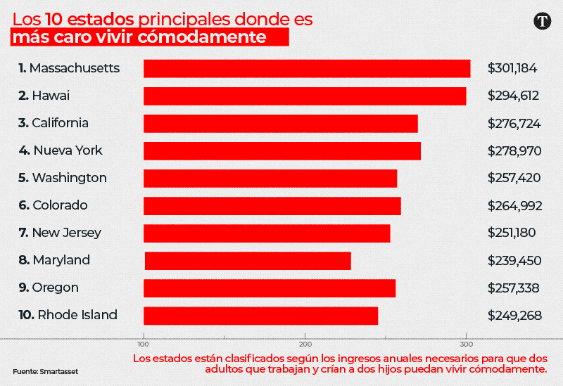 Los ingresos que necesita una familia de cuatro miembros para vivir cómodamente en los cinco estados más caros son: