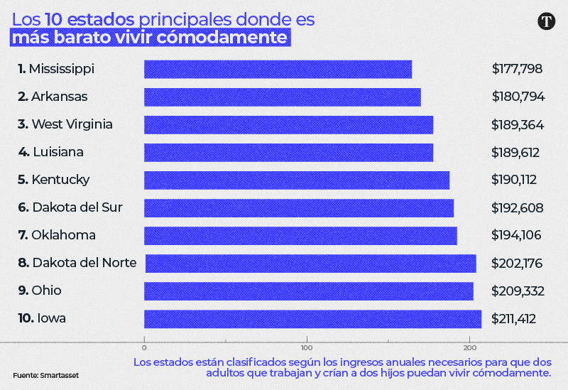 Los cinco estados principales donde es más barato vivir, clasificados según los salarios anuales necesarios para que dos adultos que trabajan y crían a dos hijos puedan vivir cómodamente es: