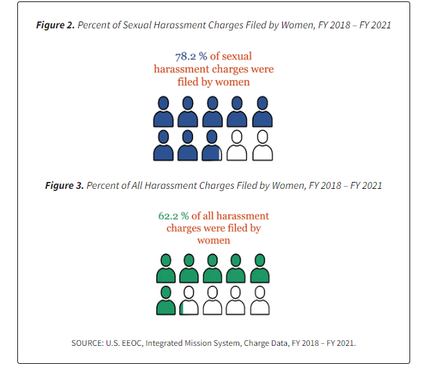 La EEOC explica que entre el año fiscal 2018 y el año fiscal 2021, los cargos de acoso sexual representaron el 27.7 % de todos los cargos de acoso en comparación con el 24.7 % de todos los cargos de acoso entre el año fiscal 2014 y el año fiscal 2017.