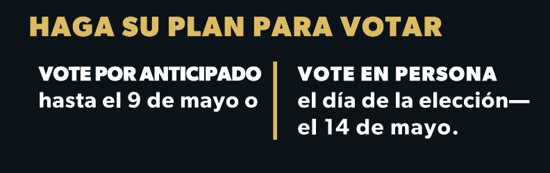 Voto anticipado en persona: La votación anticipada en persona comienza el martes 2 de mayo y termina el 9 de mayo de 2024. Los centros de votación estarán abiertos de 7 a.m. a 8 p.m.