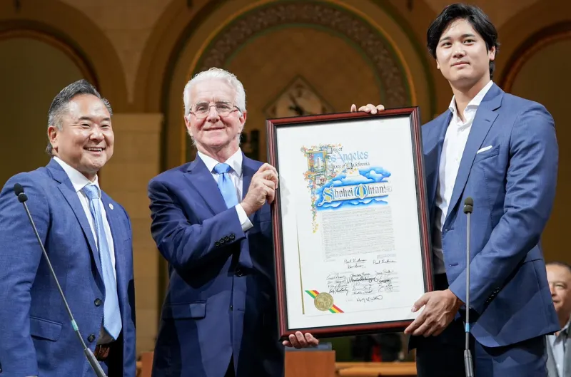 En una emotiva ceremonia celebrada en el Ayuntamiento de Los Ángeles, los directivos de los Dodgers, entre ellos el gerente Dave Roberts y el director general Stan Kasten, junto con entusiastas aficionados, se reunieron para rendir homenaje a la excepcional trayectoria de Ohtani.