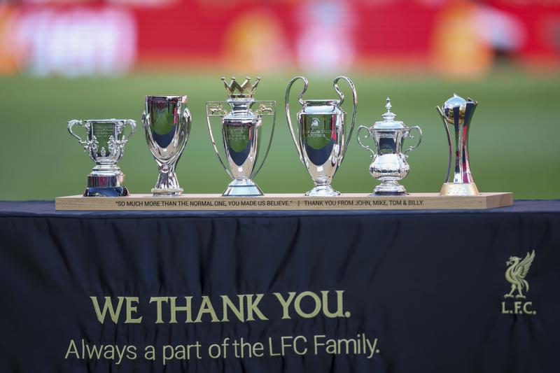 Réplicas de los trofeos ganados por el entrenador del Liverpool, Jurgen Klopp, de la familia del LFC tras el partido de fútbol de la Premier League inglesa del Liverpool FC contra el Wolverhampton Wanderers, en Liverpool, Gran Bretaña, el 19 de mayo de 2024. (Reino Unido) EFE/EPA/ADAM VAUGHAN.