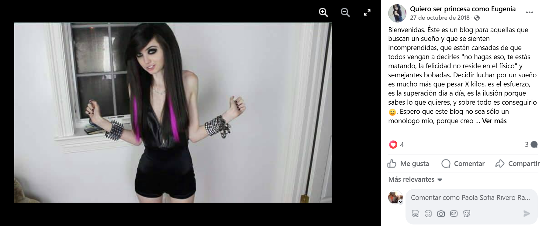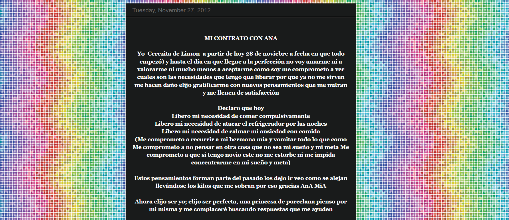 Este texto fue publicado en 2009 por Alejandra, una chica española de 17 años, como mensaje de bienvenida a un fotolog, una red en internet en la que colgaban fotos y esperaban comentarios. En su blog, la española contaba orgullosa como en tres días tan sólo consumió 500 calorías.