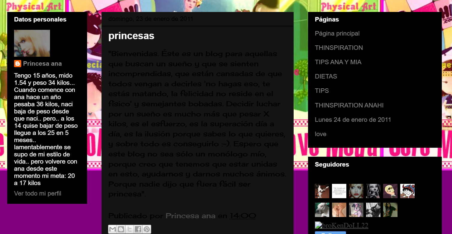 Muchas de las personas que pertenecen a estas comunidades utilizan este texto como biografía o entrada a su página. A este grupo pertenece cualquier persona con un trastorno alimenticio y se llaman de princesa o príncipe. Está conformada principalmente por personas con anorexia o bulimia, quienes se distinguen bajo el nombre Ana o Mia.