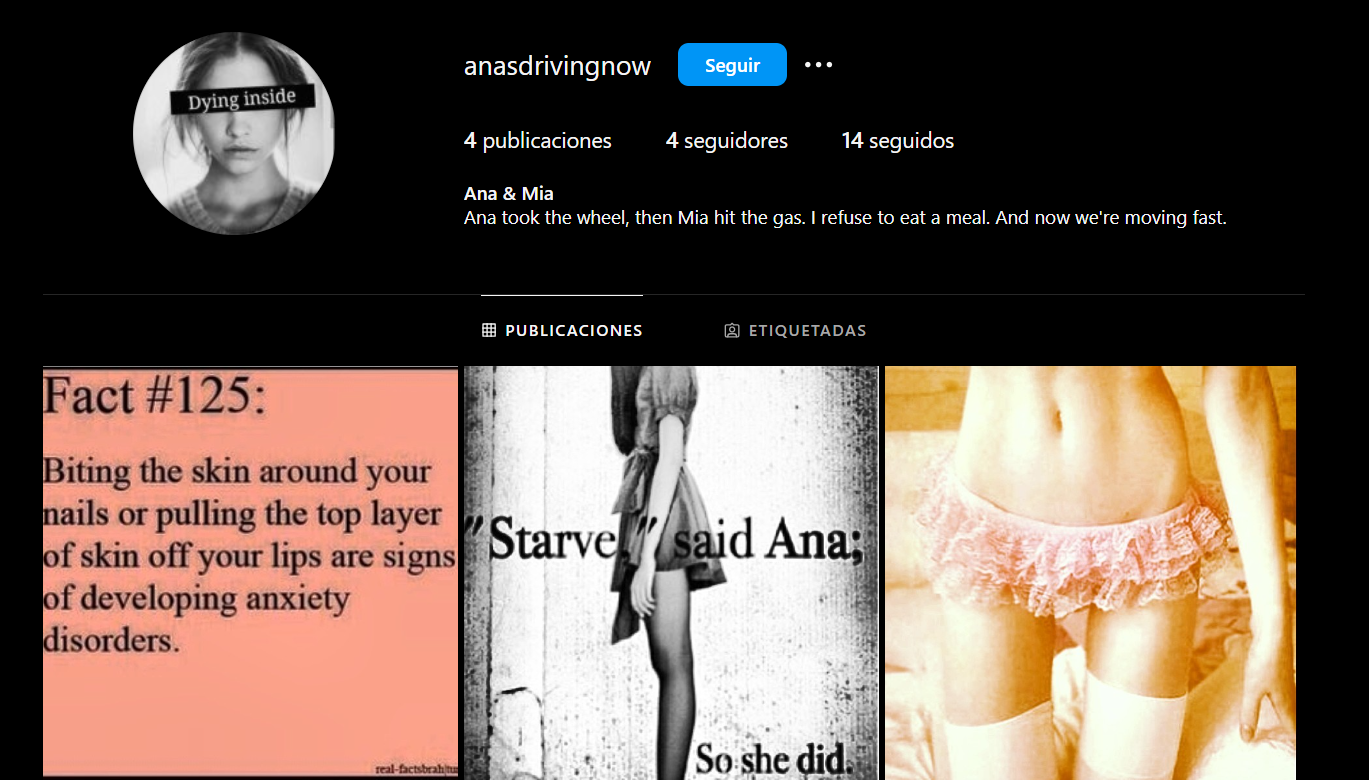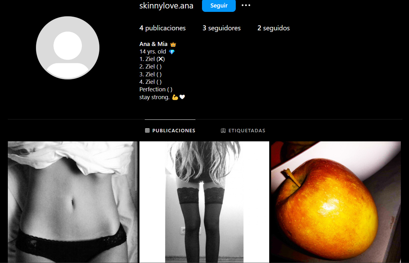 Estos perfiles fomentan los TCA como un medio para conseguir lo que estas chicas consideran es el concepto de un cuerpo "perfecto", que suele tener un aspecto frágil. Fomentan cuerpos esqueléticos y se rigen por lemas asociados a que no deben parar hasta que se marquen sus huesos. "Yo empecé a tener una obsesión con esto", confesó Teresa.