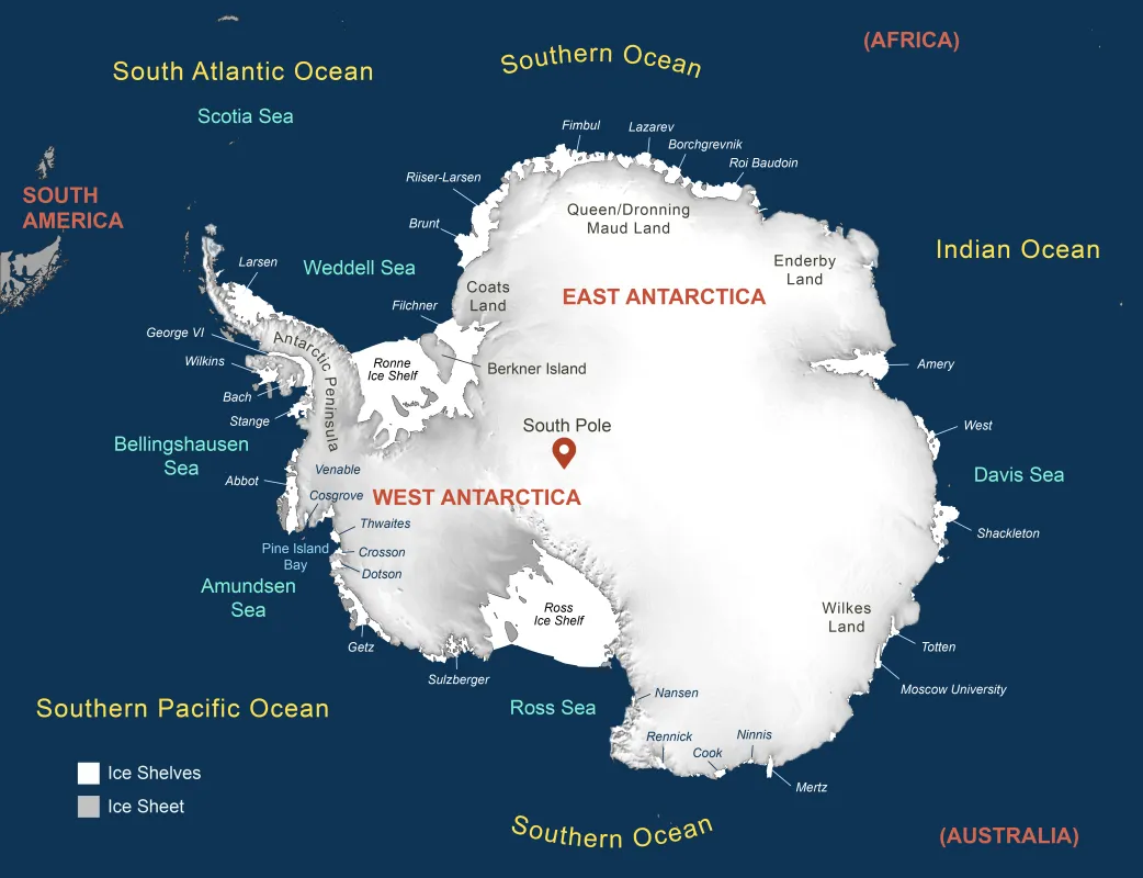 La capa de hielo de la Antártida es una gran masa de hielo, acumulada durante milenios a través de las nevadas, que se asienta sobre un lecho de roca y cubre casi toda la Antártida. A medida que el hielo se extiende y se encuentra con el océano, una parte comienza a flotar. Estas plataformas de hielo flotantes, que rodean aproximadamente las tres cuartas partes de la Antártida, se denominan plataformas de hielo.