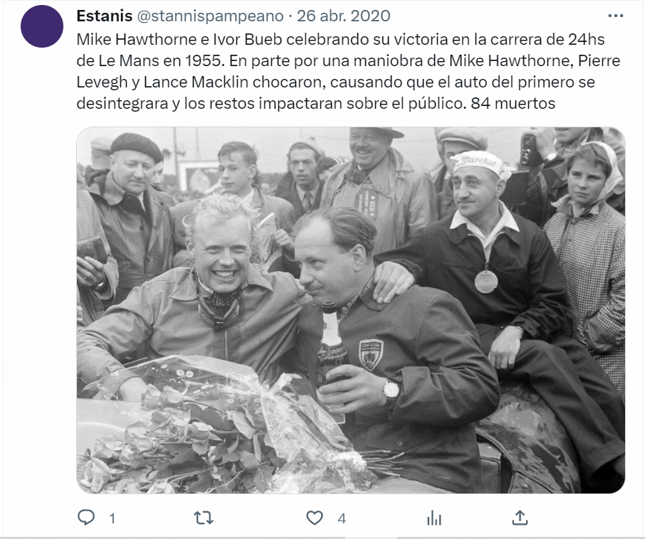 Hasta los 300 mil espectadores que asistieron al Circuito de Sarthe el 11 de junio de 1955 para vivir una carrera inolvidable fueron visitados por la muerte cuando los restos en llamas del Mercedes conducido por el francés Pierre Levegh volaron hacia la gente. Los heridos y muertos fueron trasladados en vallas publicitarias que se convirtieron en camillas improvisadas.