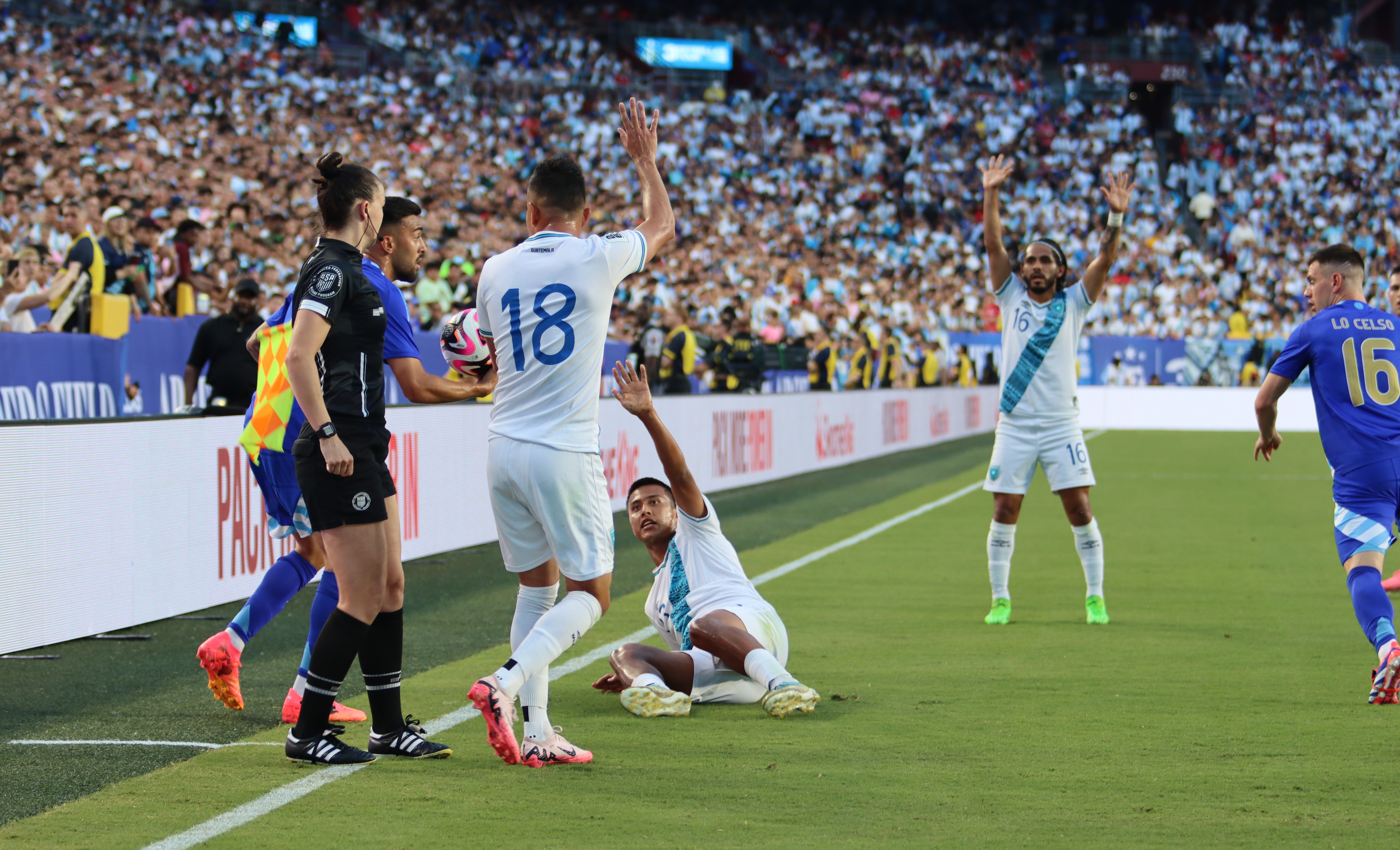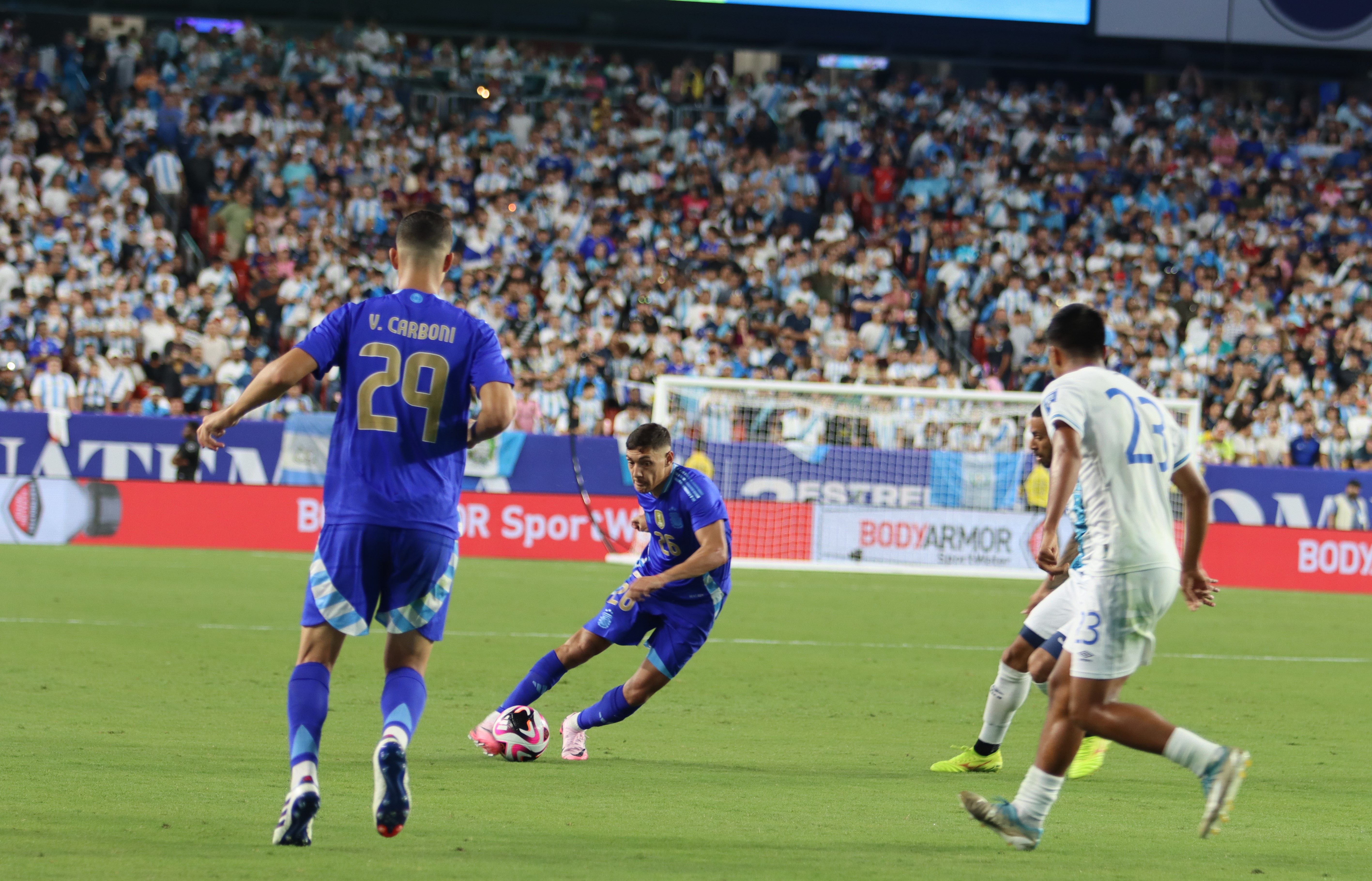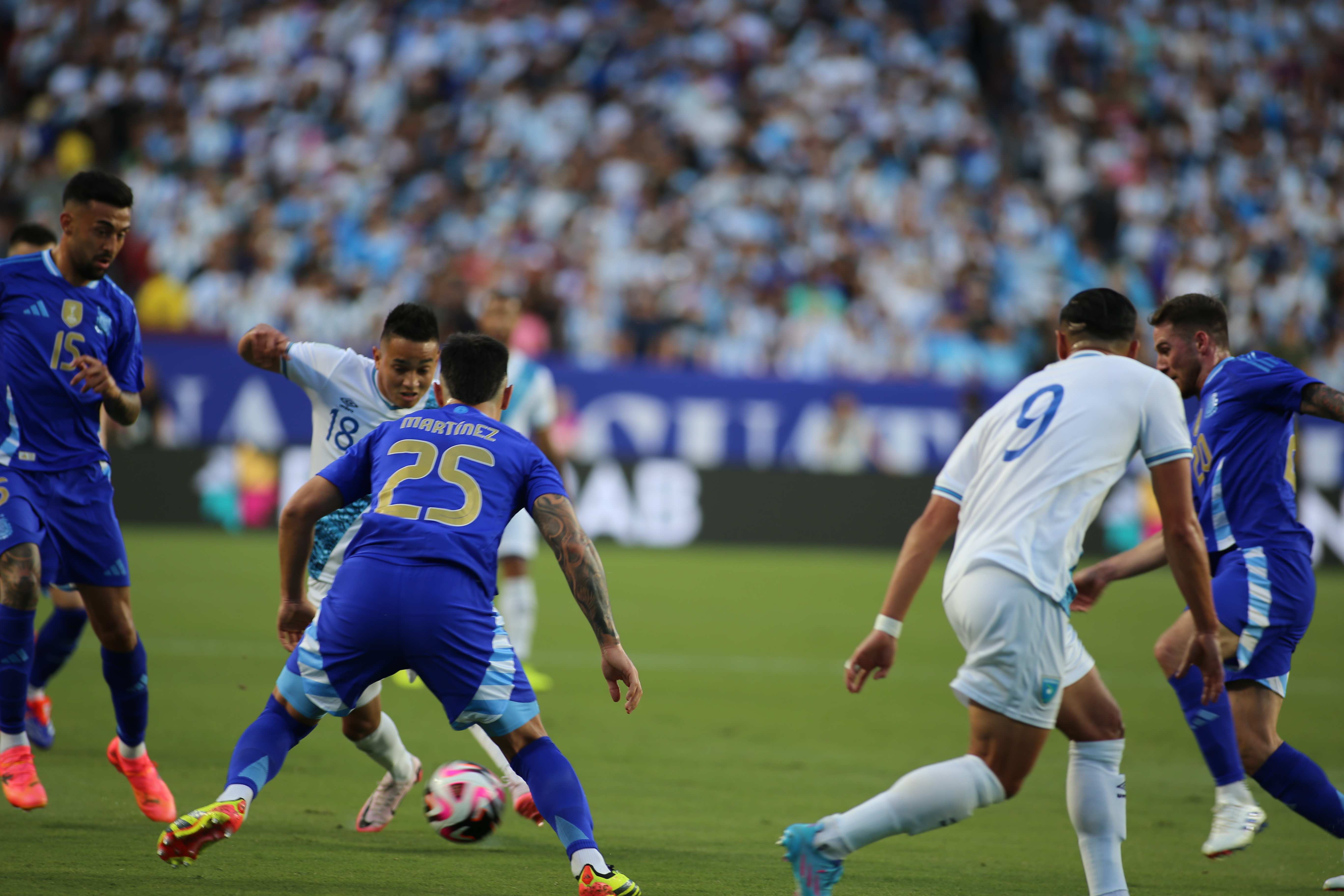 Argentina comenzó el partido con un sorpresivo autogol a los cuatro minutos, cuando un tiro libre de Guatemala desde la izquierda llevó a Emiliano Martínez a intervenir. En el rebote, la pelota se desvió en Nahuel Molina y finalmente en Lisandro Martínez, entrando en su propio arco. Sin embargo, la Albiceleste se recuperó rápidamente y tomó control del juego, logrando una contundente victoria de 4-1. La presión alta de Argentina forzó al arquero guatemalteco Nicholas Hagen a cometer un error fatal en la salida, entregándole la pelota a Lionel Messi, quien empató el partido en el minuto 12. Poco después del empate, Dibu Martínez salió del área para cortar una jugada, pero el rechazo terminó en poder de Óscar Castellanos, quien intentó un remate bombeado de larga distancia que pasó muy cerca del travesaño.