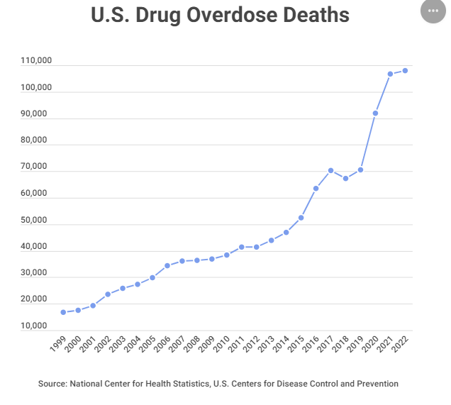 Oficialmente, hubo 107,941 muertes por sobredosis de drogas en 2022, frente a 106,699 en 2021, según las cifras más recientes del Centro Nacional de Estadísticas de Salud, una división de los Centros para el Control y la Prevención de Enfermedades. El total no superó las 90,000 muertes hasta 2020, durante la administración de Trump.
